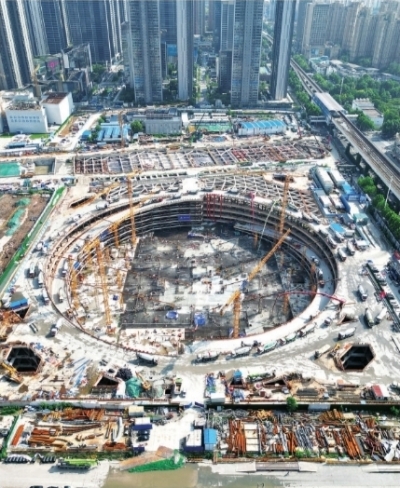 项目总经理周方华介绍,周大福金融中心地下空间工程是国内目前规模最大的超深环形支撑基坑,基坑直径188米,开挖最深处达33米,“相当于11层楼的高度”。