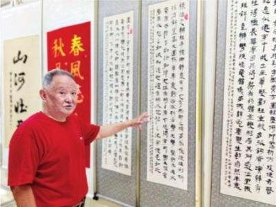 78岁的程旭东是武汉新洲人,目前是中国老年书画协会会员、武汉老年大学书法教师,其作品多次在全国获奖。程旭东年轻时是宣传队的成员,每天的工作就是走村串巷画宣传画、写各种宣传标语。“现在展示的是学员和我的一些作品。”程老师说,“书法我练到现在已经有60年了。这条竹节风韵的竹节文介于篆书和隶书之间,古朴高雅,我写了20幅,现在拿了几幅挂出来跟喜欢写字的老年朋友交流一下。”