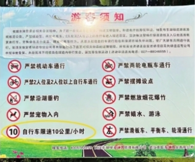 “游客须知”上写有自行车限速10公里/小时(黄圈处)。