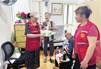 志愿者上门为老人送去新鲜熬煮的绿豆汤。