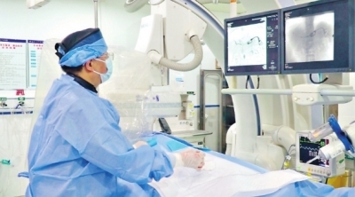 6月28日上午,介入诊疗中心的手术室内数名医生围着手术台上的黄女士忙上忙下。隔壁房间里,电脑屏幕上清晰地显示着黄女士的肝脏和肿瘤图像,细小的微导管沿着血管在她的体内缓缓上移,直到精确插入肝肿瘤几个供血动脉的预定位置。核医学科医生将分装好的钇-90药物放入专用注射器皿中,介入科医生通过专用注射系统缓缓将钇-90微球注入微导管,图像监控系统上清楚地显示着钇-90顺着血流进入肿瘤内部,同时精准地避开了沿途所有重要脏器,直抵肿瘤细胞。