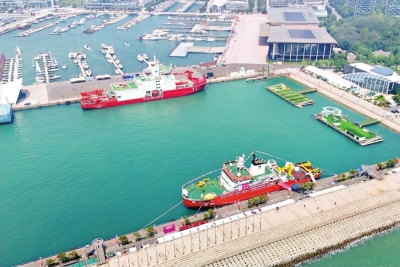 据新华社电 “雪龙2”号科考破冰船和“极地”号破冰调查船于3日上午双双亮相山东青岛奥帆中心码头(上图)。“极地”号是由我国自主设计、自主建造的新一代破冰调查船,于6月24日正式命名交付后首次面向公众开放参观。“极地”号船长89.95米、型宽17.8米、型深8.2米,设计航速15节,总吨位4600吨,船艏可破0.8米至1米厚当年冰。“雪龙2”号是全球第一艘采用船艏、船艉双向破冰技术的极地科考破冰船。该船于2019年首次参与中国极地考察,并于今年4月顺利完成中国第40次南极考察任务。