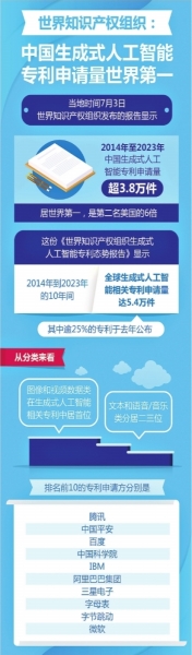 世界知识产权组织:中国生成式人工智能专利申请量世界第一