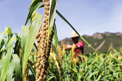 农民在河北省承德市承德县东小白旗乡东小白旗村谷物种植基地里收获小米谷穗。(资料图片)