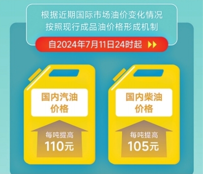 据新华社电 国家发展改革委11日发布消息,根据近期国际市场油价变化情况,按照现行成品油价格形成机制,自2024年7月11日24时起,国内汽、柴油价格每吨分别提高110元、105元。