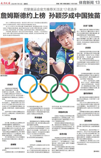 詹姆斯德约上榜 孙颖莎成中国独苗