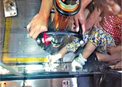 消防员到达现场时,看到一名男子怀抱着一名女童蹲坐在扶梯上,女童的右脚被卡在下行扶梯缝隙中。在商场工作人员配合下,消防员很快就把扶梯的金属侧护板拆卸下来,然后使用液压扩张器把卡在女童右脚上的扶梯踏板顶开。为防止女童受到二次伤害,消防员还将一件抢险救援服覆盖在女童身体上,并不停安抚女童。最后,消防员使用无齿锯对扶梯金属踏板进行切割,把金属踏板切割开后,将女童被卡的右脚顺利抽出。现场医护人员对女童的右脚进行简单包扎后,将女童送往医院做进一步治疗。