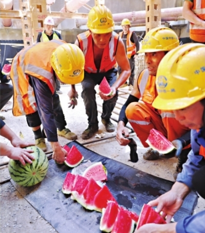 在白玉山站的另一个作业面,20余名作业人员正在绑扎底板钢筋。从被太阳暴晒的地面深入地下20米深的基坑,一台大功率风机呼呼地吹着,给建设者送去清凉。施工方中铁一局项目班组长杨朋拿着4盒藿香正气水发给作业人员,项目负责人赵勇招呼大家吃西瓜解渴。他介绍,工地有专门的休息区,准备了充足的人丹等防暑用品,并备足了西瓜、盐汽水等,为作业人员随时补充水分。