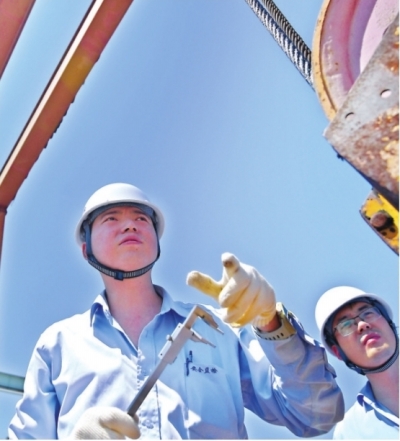 在主梁上,只见检验员拿出检验精度为0.01毫米的塞尺,对控制起重机制动系统的制动衬垫与制动轮之间的间隙进行检验。他们小心翼翼地移动,在高空中还对起重机主梁结构、安全保护装置等进行了细致检验。