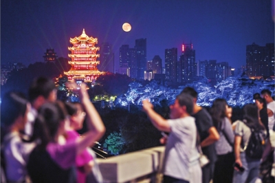7月23日晚,游客在武汉长江大桥上驻足观看圆月悬空。