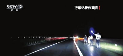 图为夏辉(右一)在高速公路上拦停车辆。