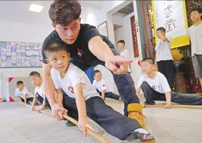 7月19日,在安徽省合肥市肥西县花岗镇一武术训练馆,小朋友们在练习武术基本功。