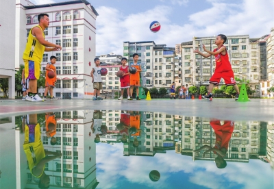 7月19日,在湖南省永州市道县树湘学校篮球训练营,孩子们参加篮球训练。