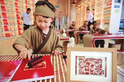 暑假期间,位于青岛栈桥书店的印象国风艺术馆举行拓印研学活动,吸引学生前来学习、体验。
