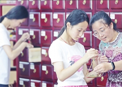 7月24日,在山东临沂第十中学中医药体验馆,老师(右)指导学生学习称量中草药。