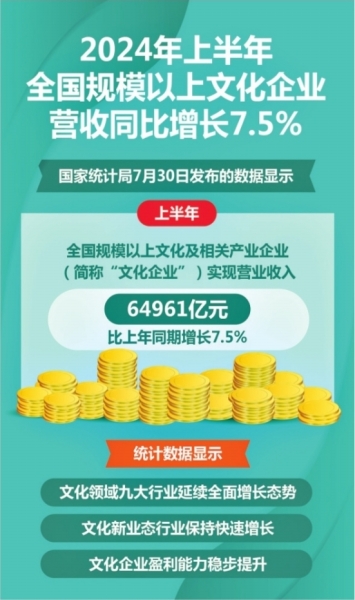2024年上半年全国规模以上文化企业营收同比增长7.5%