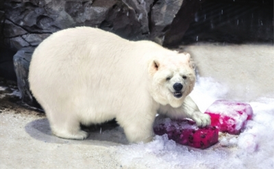 “妈妈,你看,北极熊出来了,它在啃冰棒呢。”在武汉极地海洋公园极地王国,擅长吃饭、睡觉、卖萌的北极熊“妞妞”生活在有人工降雪的室内场馆,既安逸又舒适。当看到用火龙果做成的大冰棍时,它踱着悠闲的步子,不紧不慢地吃了起来。从河南来汉的郑先生带着两个小孩,他说:“小朋友都非常喜欢小动物,一看到此情此景觉得很有趣,就挪不开步子。”