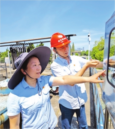 “夏季高温期是设备故障高发时段,我们更要竖起耳朵、睁大眼睛”,7日上午,李婷带领同事登上一座露天自来水沉淀池,在烈日下行走各处,仔细观察池中水质有无漂浮气泡、污物,聆听机械部件有无运行异响。池水在烈日下蒸腾,体感特别难受,不到几分钟,记者便感觉汗珠涌出,李婷和同事的工作服清晰可见大片汗渍。