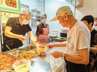 “每顿都有热饭热菜,不重样,好吃还不贵!”“90岁以上老人免费吃,中午就可以把晚餐打包带走。”提起社区食堂,社区里的老人个个赞不绝口。