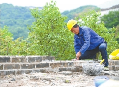 工人在修缮箭扣长城122号敌台东侧墙体垛墙(7月2日摄)。