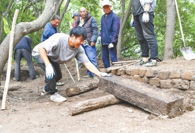 在箭扣长城120号敌台考古现场,工人们利用撬棍、滚木运输一块挖出的条石(7月2日摄)。