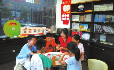 江欣苑阳小驿户外工作者驿站内,大学生志愿者陪伴孩子们下棋、读书、做作业。