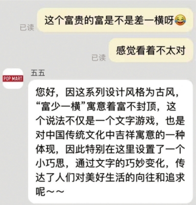 “有点硌硬,花了69元买盲盒娃娃本就是图个开心,结果还有错别字。”该网友联系了泡泡玛特淘宝官方旗舰店客服,谁知客服却说这是故意为之。客服称,“富”字少一横寓意“富不封顶”。