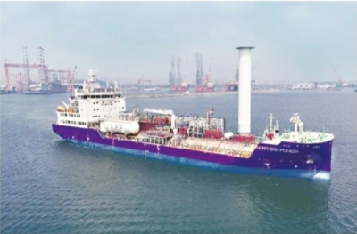据科技日报报道 8月22日,全球首制海上碳捕集及存储业务船舶——“北极光先锋”轮在大连海事局执法船艇“海巡0301”轮的护航下,顺利完成首次出海试航(上图)。待正式交付后,该轮将成为全球首批专业服务于海上二氧化碳运输与碳捕集及存储业务的船舶之一。该轮总长约130米,型宽21.2米,结构吃水8米,入级DNV船级社,由大连船舶重工集团有限公司自主设计完成,是全球首制7500立方米液态二氧化碳运输船,将为消减陆地二氧化碳排放作出积极示范。