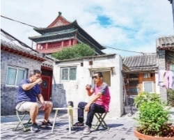 在北京钟鼓楼下的钟楼湾胡同里,市民在自家院子里喝茶(2023年6月12日摄)。