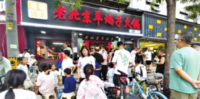 北京西二旗亮健容天老北京羊蝎子火锅店门口摆了两排塑料凳子,大概20把。8月24日晚上7时许,这里坐满了人,路边停的车之间又三三两两站着20多人,都是等位的食客。两位原本并排行走的女士不得不一前一后从人群中挤过去,疑惑地问:“这是在搞什么活动吗?”