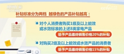 而补贴标准分为两档,越绿色的产品补贴越高:对个人消费者购买1级及以上能效或水效标准的上述8类家电产品,给予产品最终销售价格20%的补贴;对购买2级及以上能效或水效产品的消费者,给予产品最终销售价格15%的补贴。每位消费者每类产品都可以补贴1件,最高补贴金额为2000元。