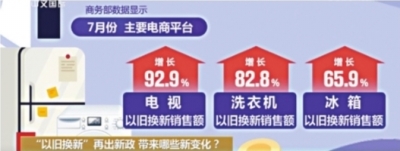 从今年3月国家出台家电以旧换新政策以来,各地都推出了优惠活动吸引消费者。商务部数据显示,7月份,主要电商平台电视机、洗衣机、冰箱以旧换新销售额分别增长92.9%、82.8%和65.9%。
