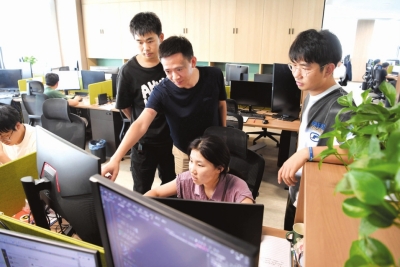 华工科技中央研究院的软件工程师在一起研究设计方案。