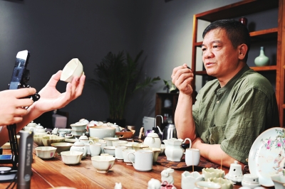 在位于江西省景德镇市善窑厂的工作室里,李善明在通过直播介绍自己的汝瓷产品(8月28日摄)。