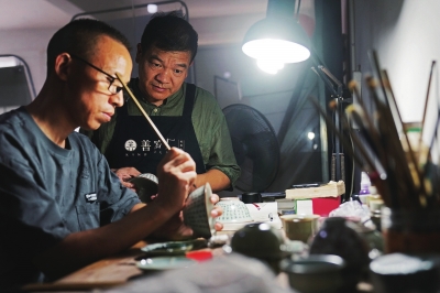 在位于江西省景德镇市善窑厂的车间里,李善明(右)在与画工交流(8月28日摄)。
