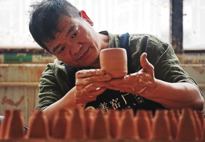 在位于江西省景德镇市善窑厂的车间里,李善明在进行拉坯(8月28日摄)。