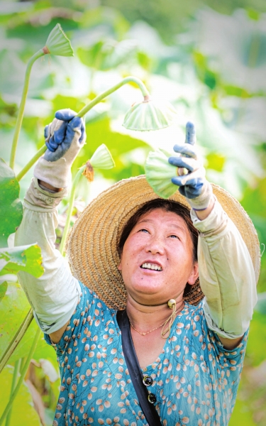 9月3日,村民唐建英正在采摘成熟的莲蓬。