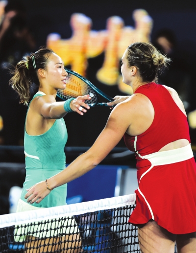 萨巴伦卡(右)与郑钦文在今年澳网决赛后拥抱致意。
