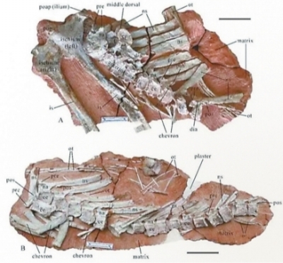 据介绍,本次长生黔江龙的标本发现于黔江上白垩统正阳组地层,为一具部分完整且关联的鸭嘴龙类恐龙骨骼,材料包括了下颌、背椎、后肢、完整的腰带以及关联的前部尾椎。