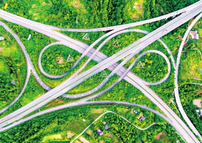 俯瞰巴中市东兴场互通,它是巴南、巴广、巴陕三条高速路的交汇点(7月6日摄,无人机照片)。