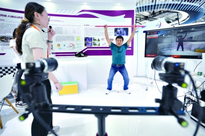 参观者在北京服贸会现场体验人体运动能力评估系统。