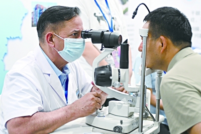 工作人员在银川养老服务业博览会上为参观者做眼部检查。