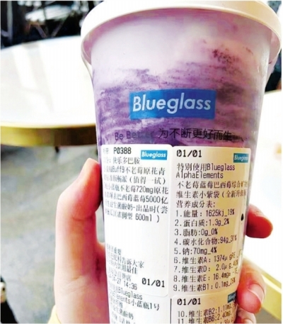 在店员推荐下,记者花费45元在汉口一家Blueglass门店点了销量较好的一款“小蛮腰buff9不老莓原花青素标准版畅派”。在该款酸奶的配料表上写着:“特别使用Blueglass AlphaElements‘小蓝瓶’1号高膳食纤维活性益生菌酸奶;添加了高膳食纤维含量大于等于10g/100g;动物双歧杆菌乳亚种;嗜酸乳杆菌;唾液链球菌嗜热亚种;德氏乳杆菌保加利亚亚种;B420动物乳双歧杆菌亚种及每整杯5000亿活性益生菌。”