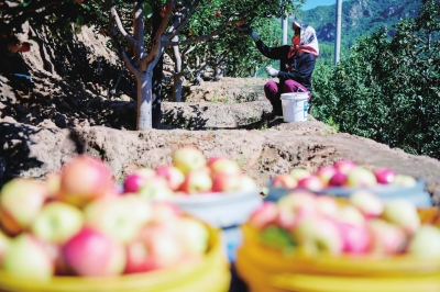 9月12日,农民在河北围场县四道沟乡一处果园采收金红苹果。