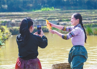 哈尼族姑娘在元阳县新街镇大鱼塘村的梯田直播抓鱼。
