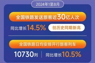 据新华社电 记者19日从中国国家铁路集团有限公司获悉,今年1至8月,全国铁路发送旅客近30亿人次,同比增长14.5%,创历史同期新高,全国铁路运输安全平稳有序。