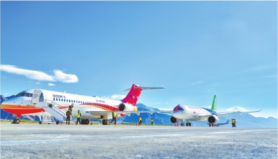 C919飞机(右)与正在进行演示飞行的国产支线客机ARJ21相聚在青藏高原。