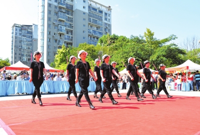 共结都市缘,共建幸福园。活动现场由社区文艺达人等表演的威风锣鼓、歌舞、模特秀等节目轮番登场,身着金色服装、头系红色发带的南湖大妈威风锣鼓队带来的开场表演《祝福祖国三杯酒》颇有气势,瞬间点燃现场气氛;头戴爵士帽、手持手杖,南湖大妈走秀队带来模特秀《爵士风走秀》,优雅步伐引来阵阵掌声……