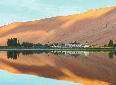 9月21日,拥有“沙漠故宫”之称的巴丹吉林庙在湖光山色之中映出倒影。