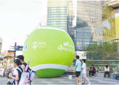 9月29日,光谷广场步行街,一个直径约五米的“巨型网球”装点街头,为即将启幕的2024武汉网球公开赛拉响前奏!